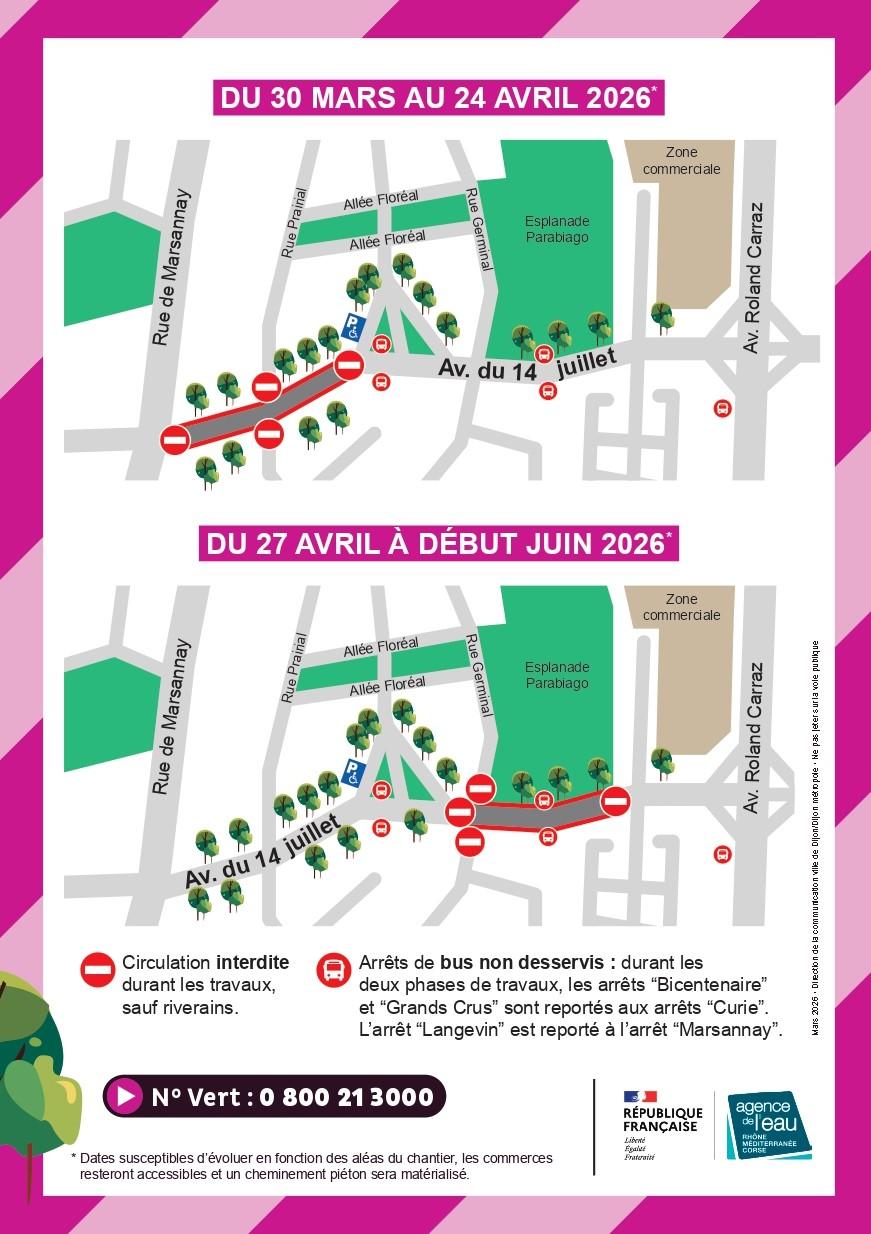 > Réseau Divia : ligne 4 déviée : durant la phase 1, les arrêts « Bicentenaire » et « Grands Crus » sont reportés aux arrêts « Curie ». L’arrêt « Langevin » est reporté à l’arrêt « Marsannay ».